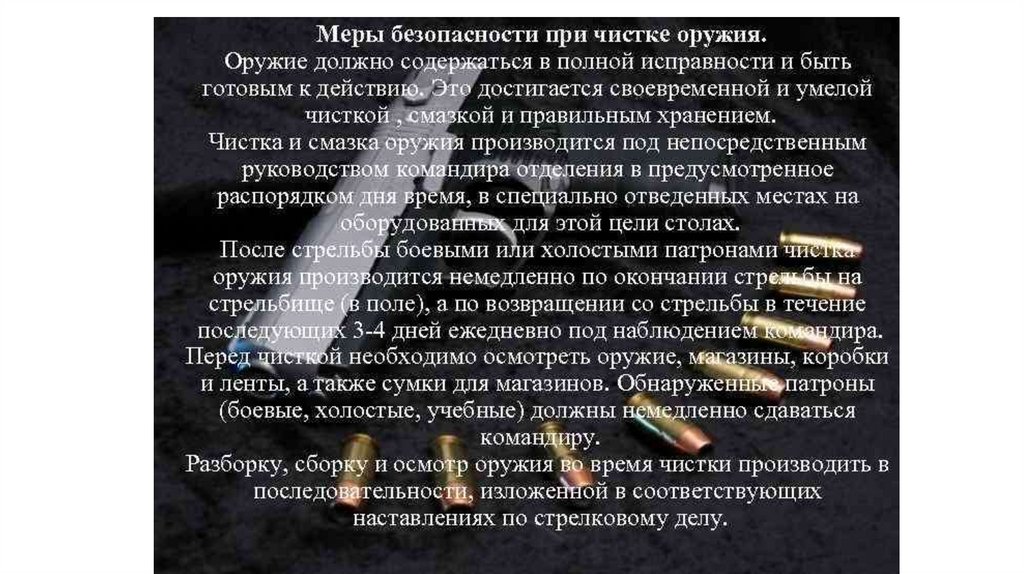 • 5. Проводить регулярный технический осмотр оружия и боеприпасов.