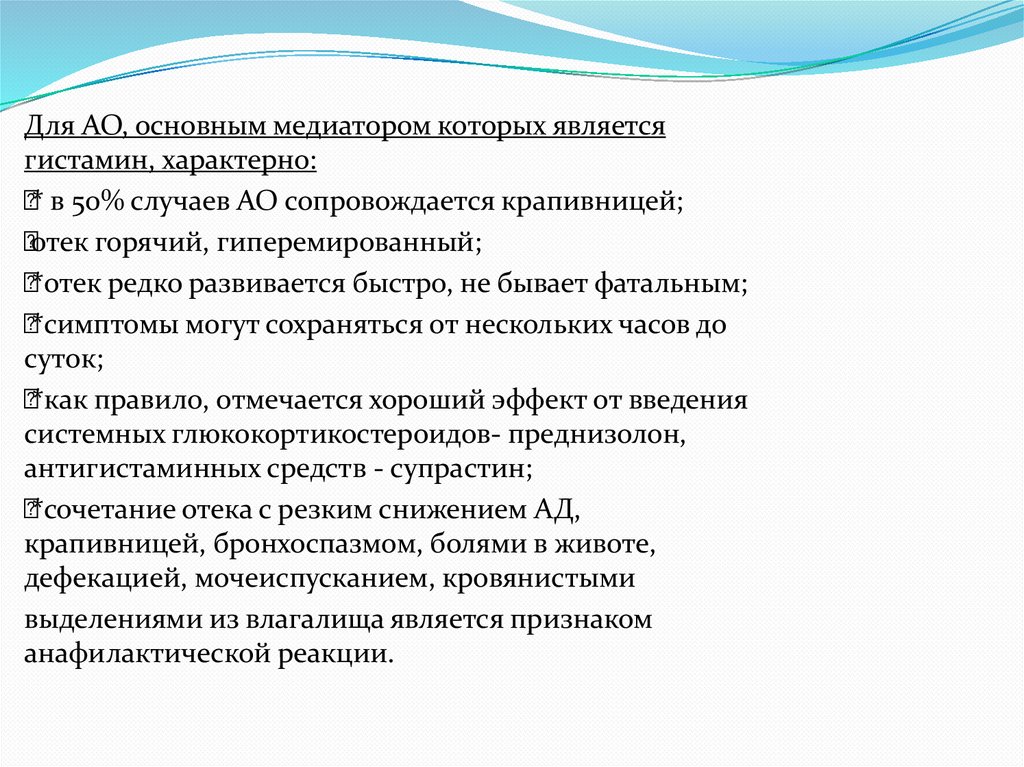 Для АО, основным медиатором которых являетсягистамин, характерно: