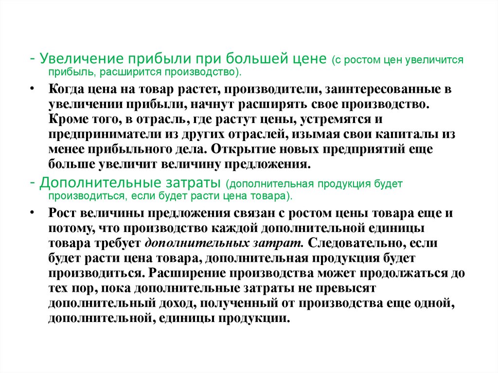 - Увеличение прибыли при большей цене (с ростом цен увеличитсяприбыль, расширится производство).