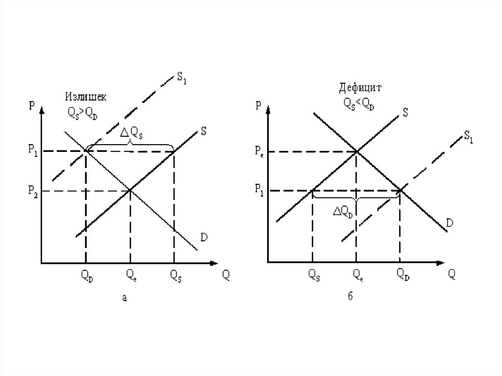 16. Если реальная рыночная цена (P1) оказывается ниже цены равновесия Pe, то объем спроса (QD) превышает объем предложения QS,