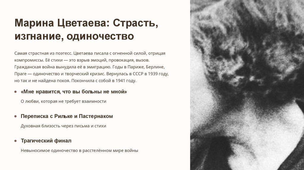 Самая страстная из поэтесс. Цветаева писала с огненной силой, отрицая
