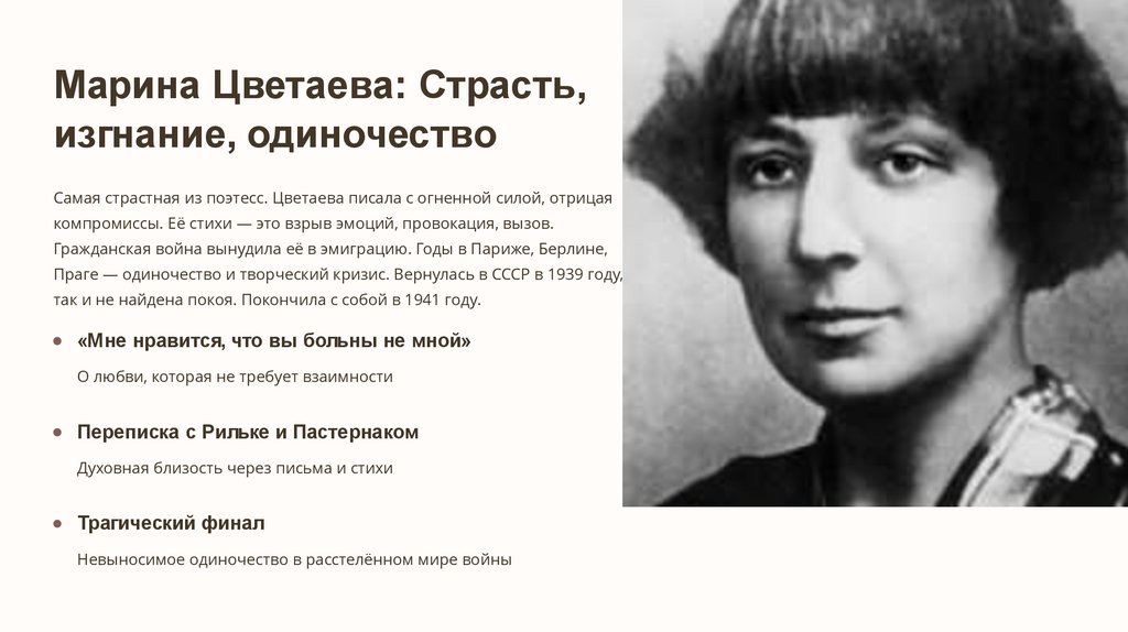 Самая страстная из поэтесс. Цветаева писала с огненной силой, отрицая