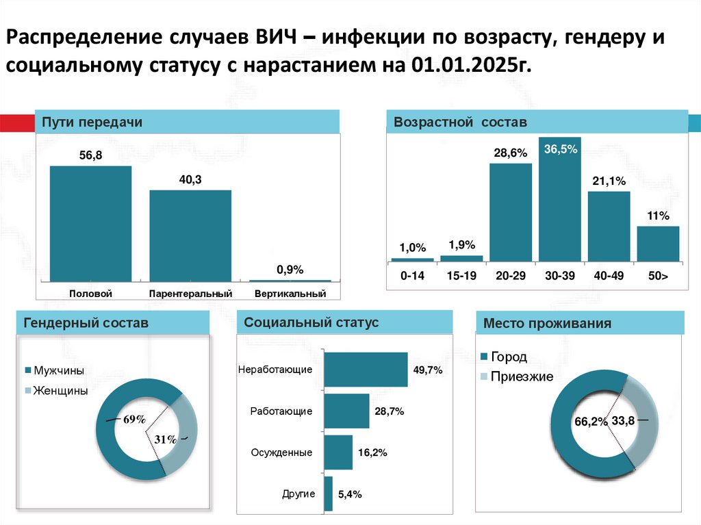 Распределение случаев ВИЧ – инфекции по возрасту, гендеру исоциальному статусу с нарастанием на 01.01.2025г.