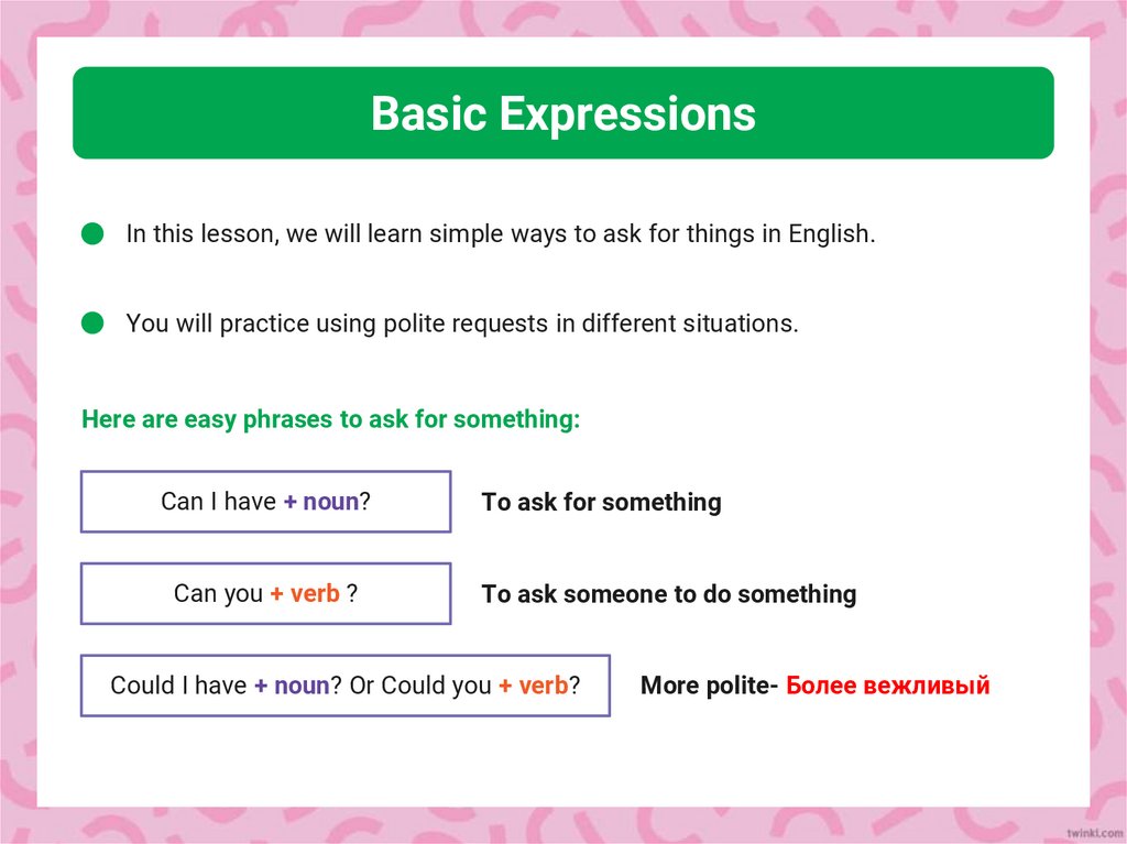 Basic ExpressionsIn this lesson, we will learn simple ways to ask for things in English.