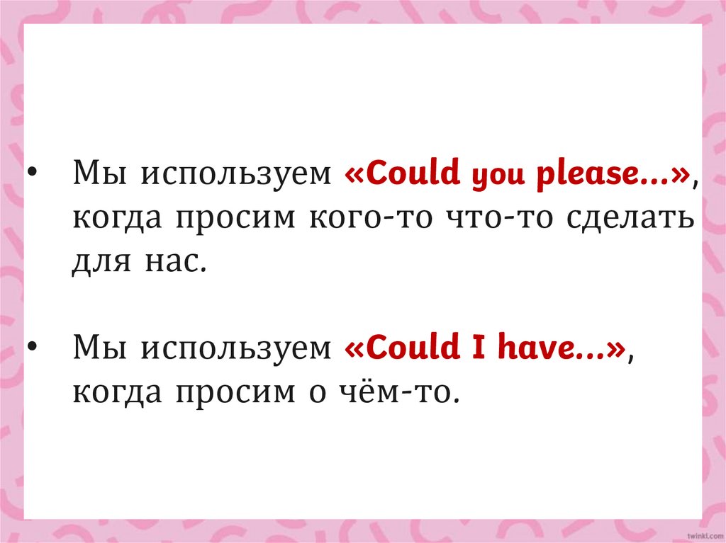 • Мы используем «Could you please...»,когда просим кого-то что-то сделать