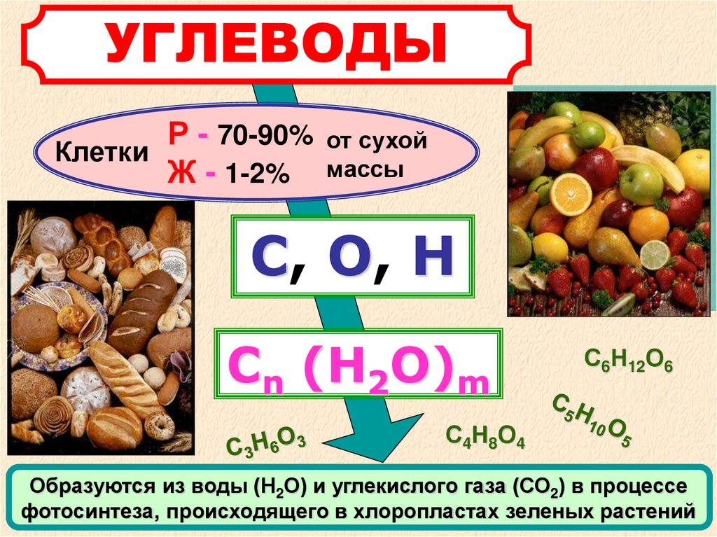 Образуются из воды (Н2О) и углекислого газа (СО2) в процессе