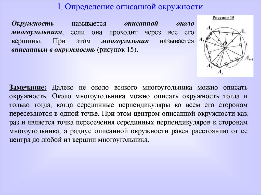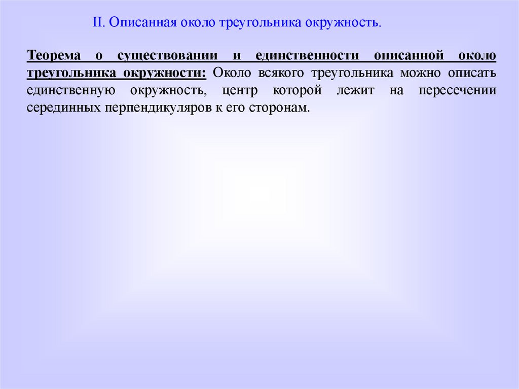II. Описанная около треугольника окружность.Теорема о существовании и единственности описанной около
