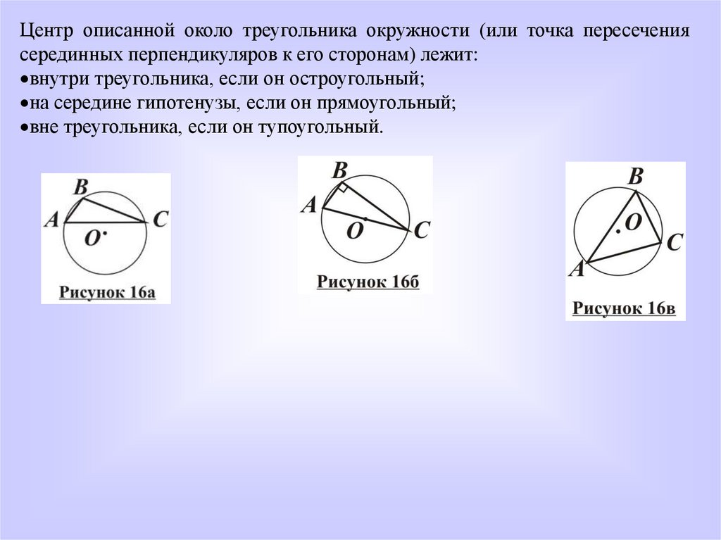 Центр описанной около треугольника окружности (или точка пересечениясерединных перпендикуляров к его сторонам) лежит: