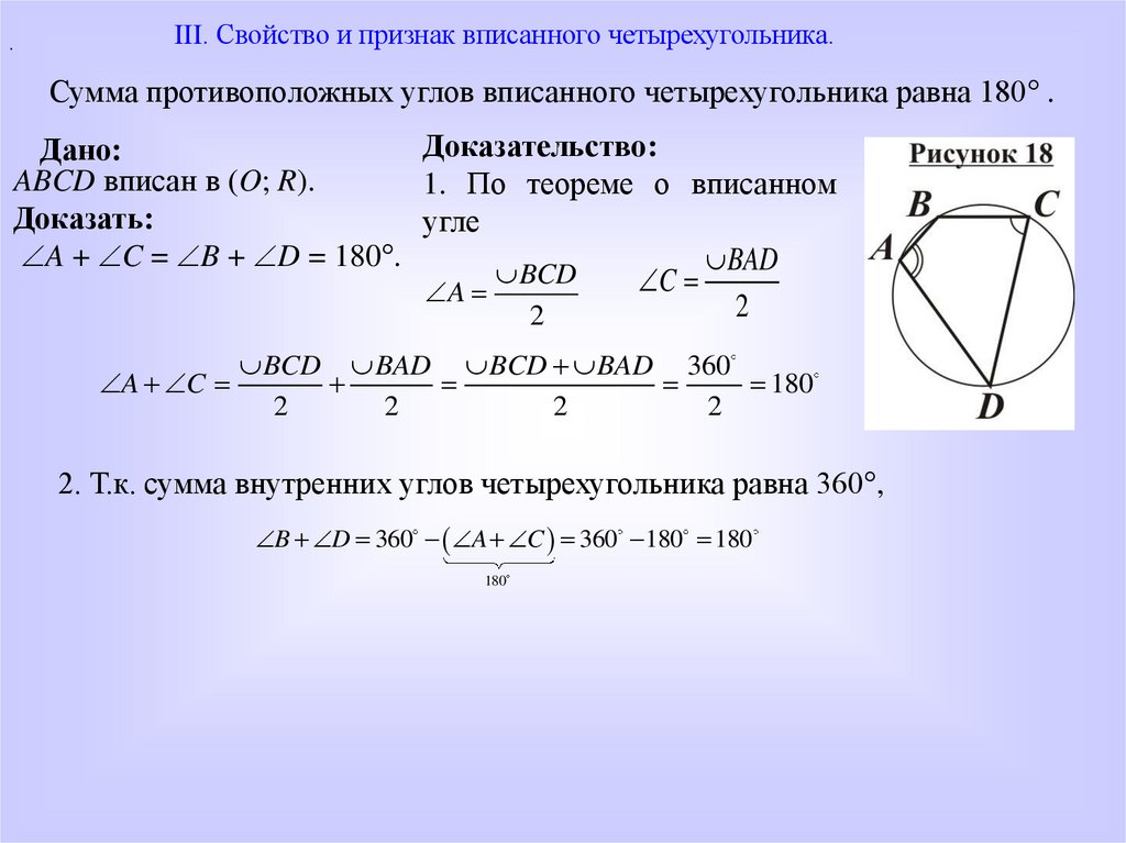Сумма противоположных углов вписанного четырехугольника равна 180° .