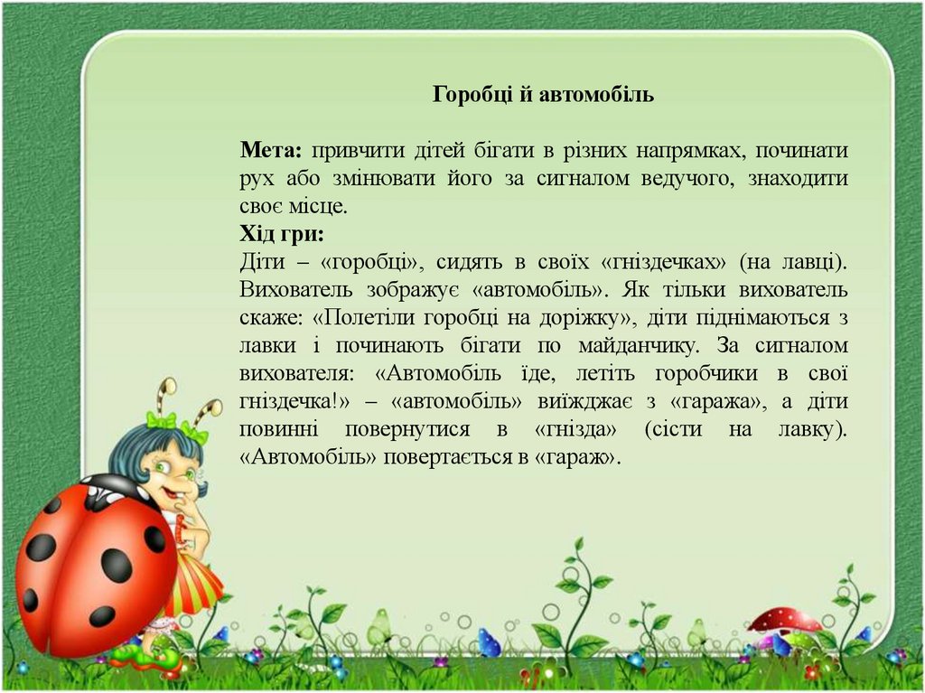 Горобці й автомобільМета: привчити дітей бігати в різних напрямках, починати