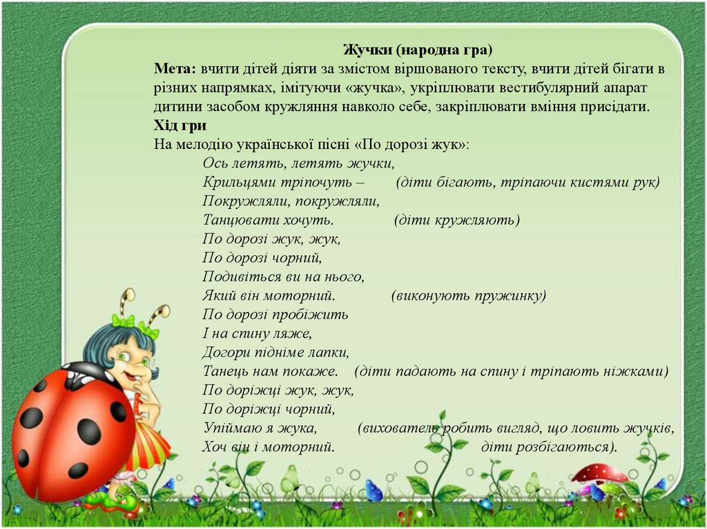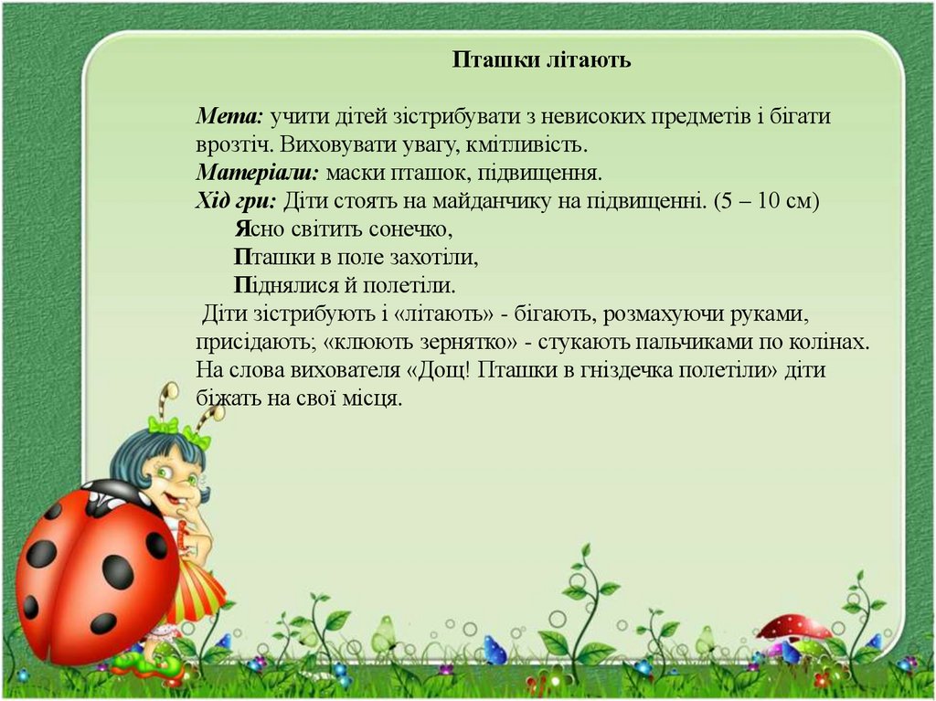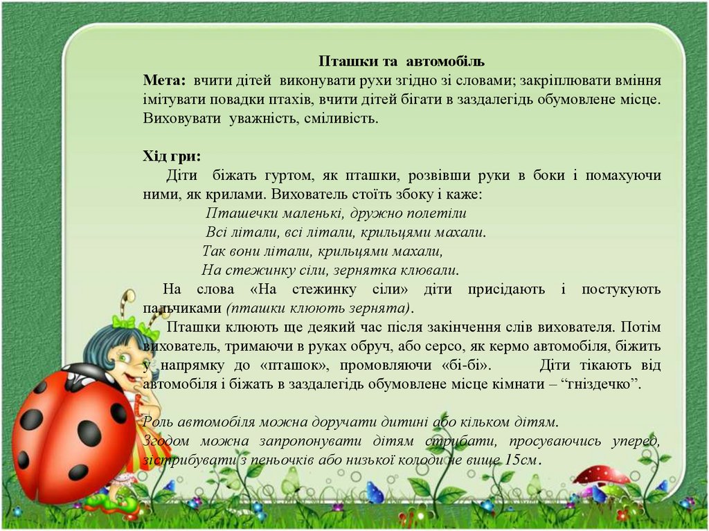 Пташки та автомобільМета: вчити дітей виконувати рухи згідно зі словами; закріплювати вміння