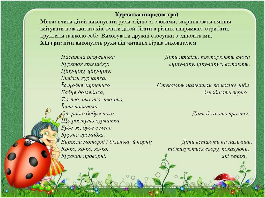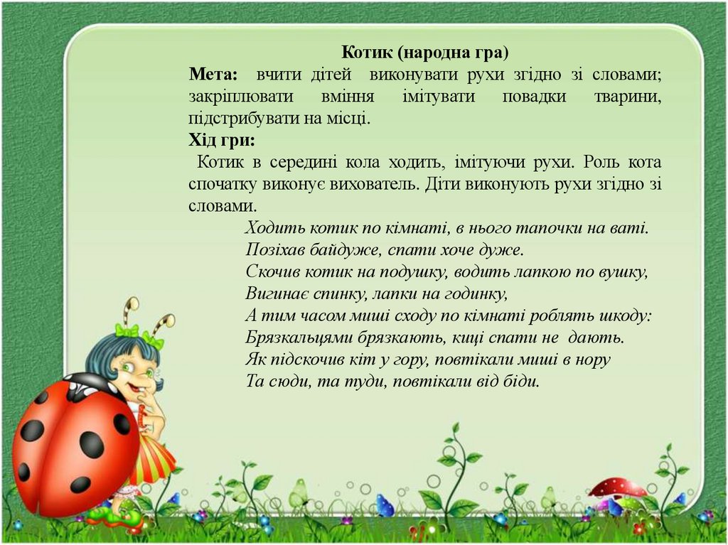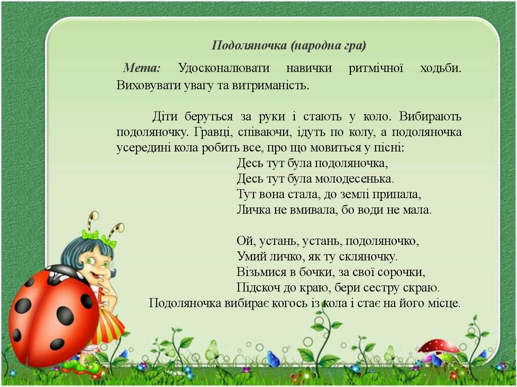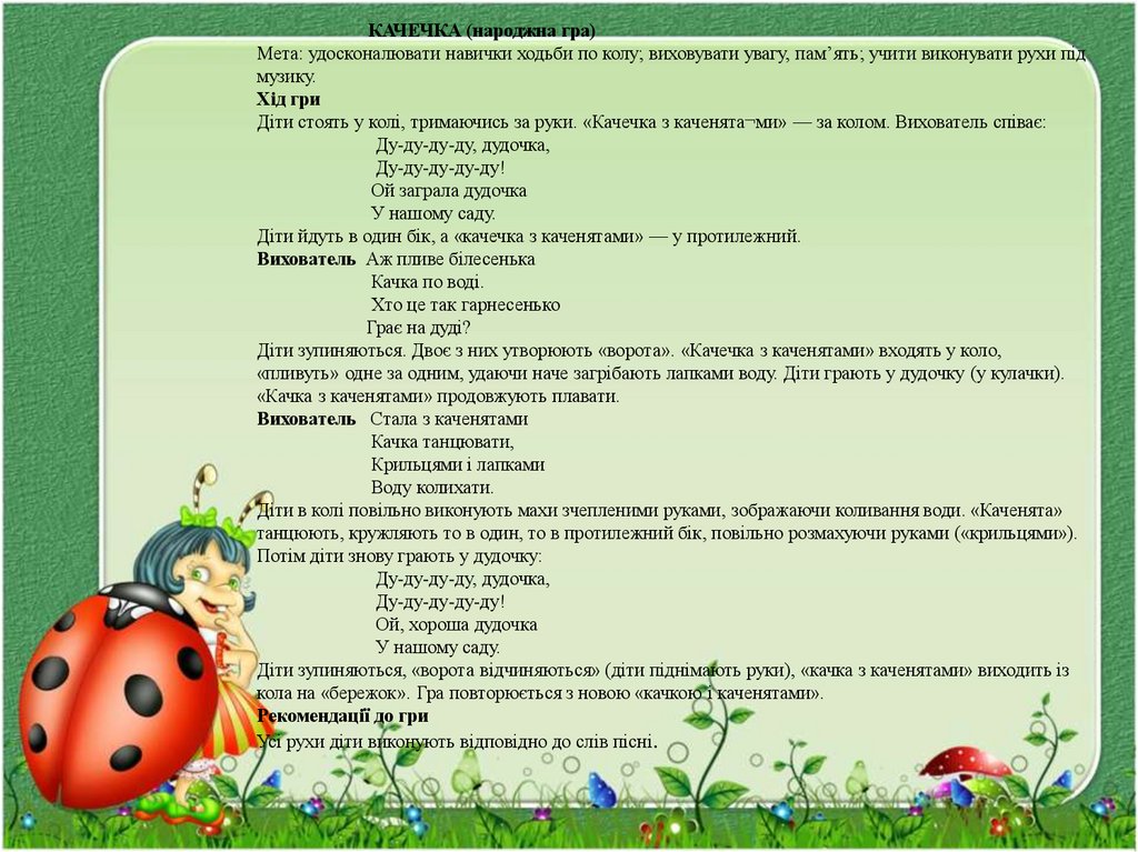 КАЧЕЧКА (народжна гра)Мета: удосконалювати навички ходьби по колу; виховувати увагу, пам’ять; учити виконувати рухи під