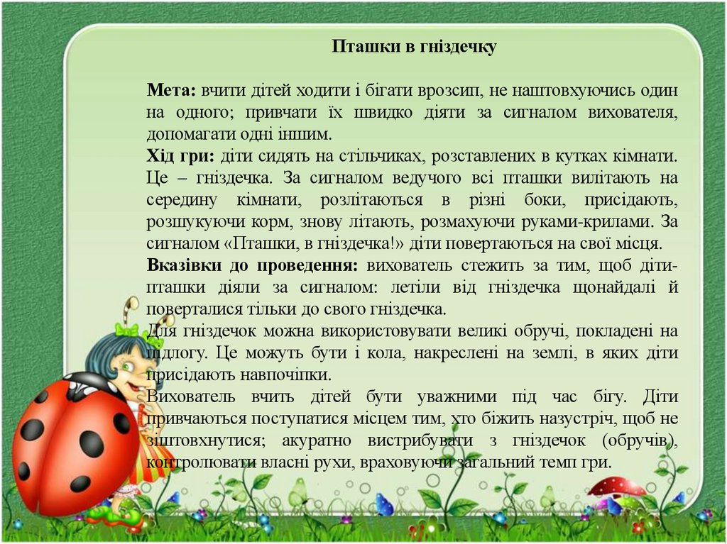 імітувати повадки птахів, вчити дітей бігати в заздалегідь обумовлене місце.