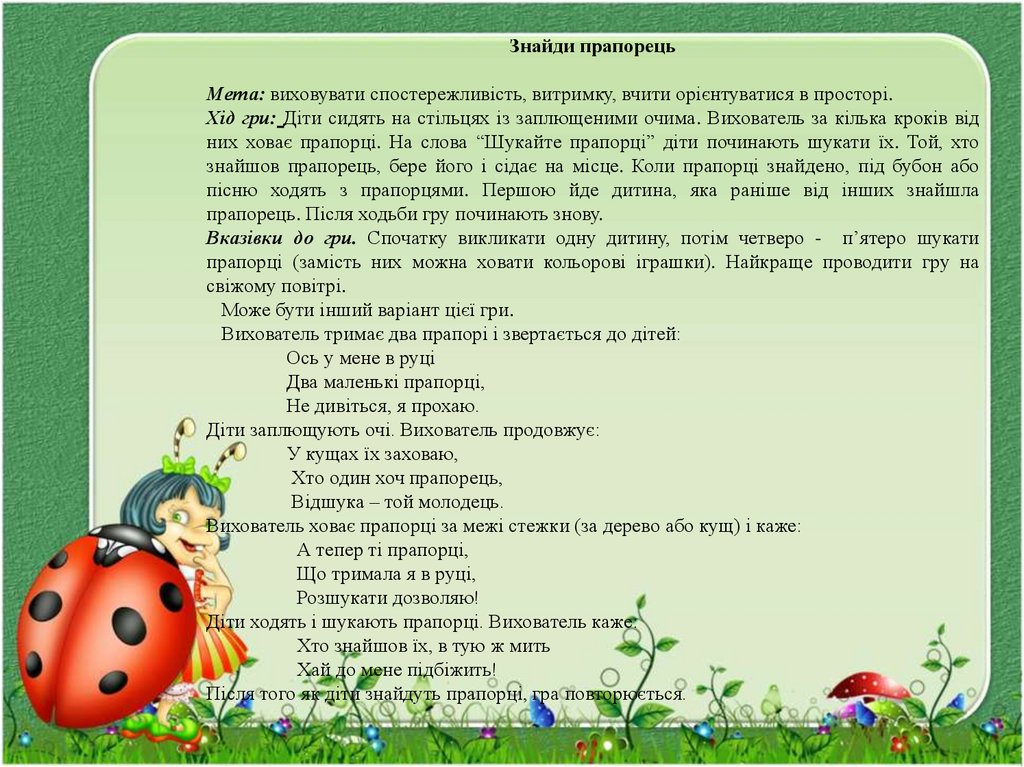 Вихователь ховає прапорці за межі стежки (за дерево або кущ) і каже:
