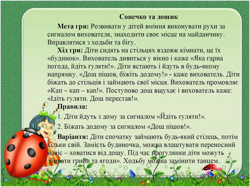 Вказівки до гри: вихователь стежить щоб діти не бігли раніше, ніж