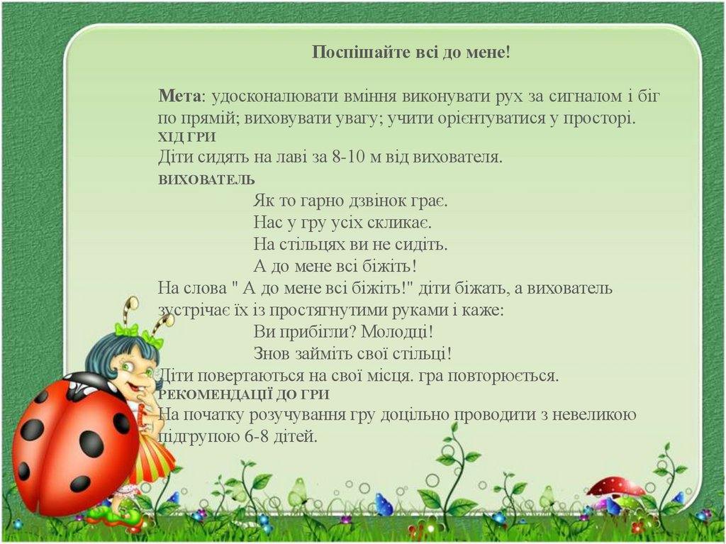 Поспішайте всі до мене!Мета: удосконалювати вміння виконувати рух за сигналом і біг