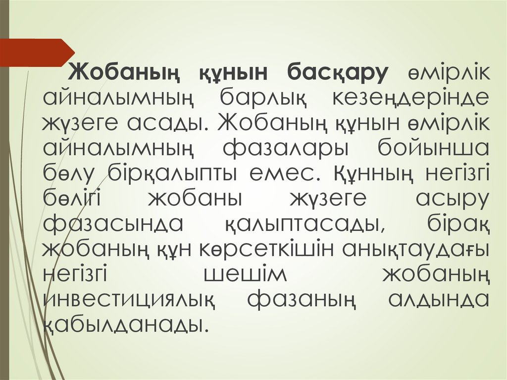 Жобаның құнын басқару өмірлікайналымның барлық кезеңдерінде
