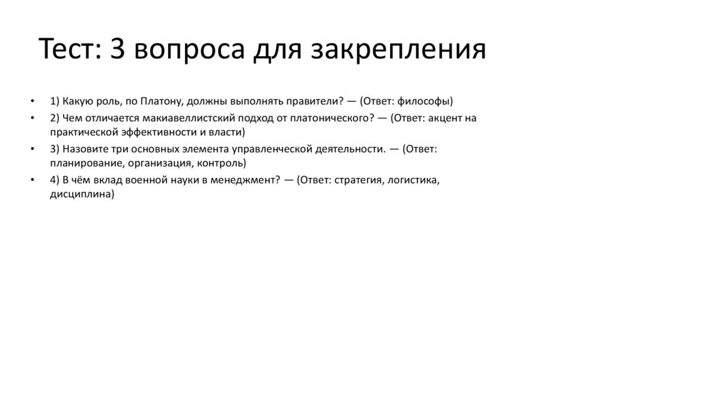 Тест: 3 вопроса для закрепления1) Какую роль, по Платону, должны выполнять правители? — (Ответ: философы)