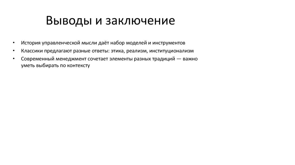 Выводы и заключениеИстория управленческой мысли даёт набор моделей и инструментов
