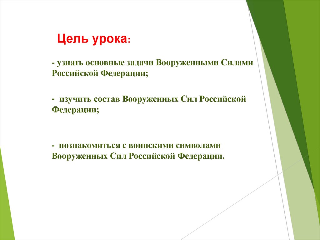 Цель урока:- узнать основные задачи Вооруженными Силами
