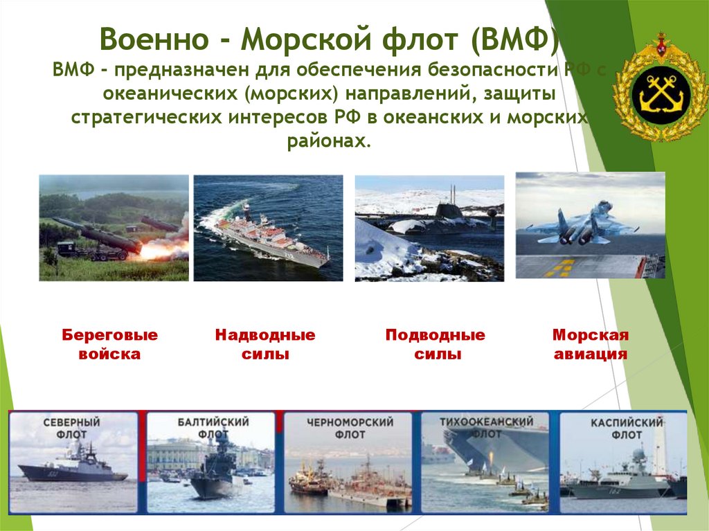 Военно - Морской флот (ВМФ)ВМФ - предназначен для обеспечения безопасности РФ с