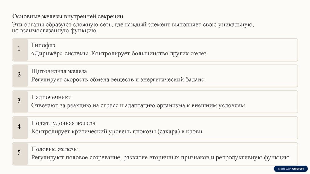 Основные железы внутренней секрецииЭти органы образуют сложную сеть, где каждый элемент выполняет свою уникальную,
