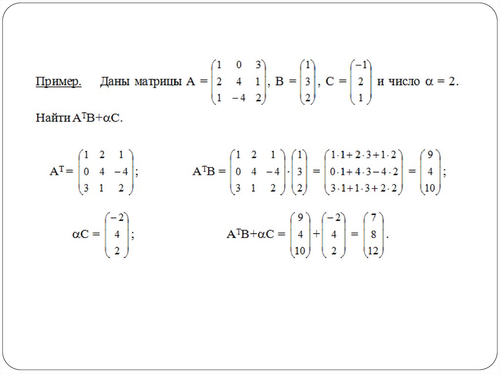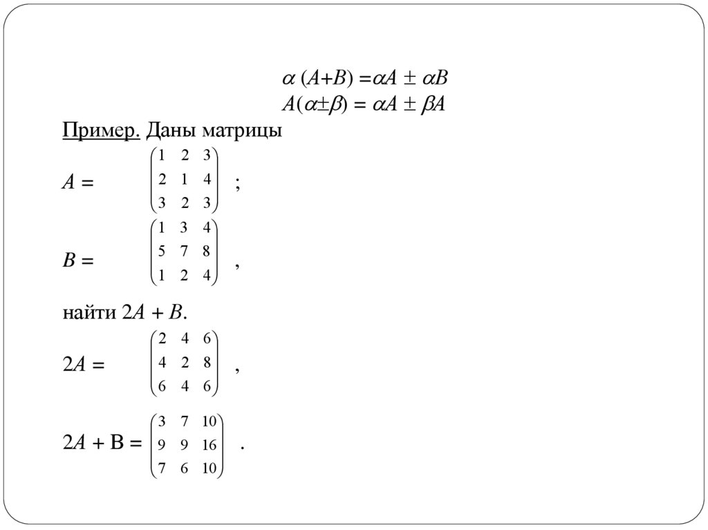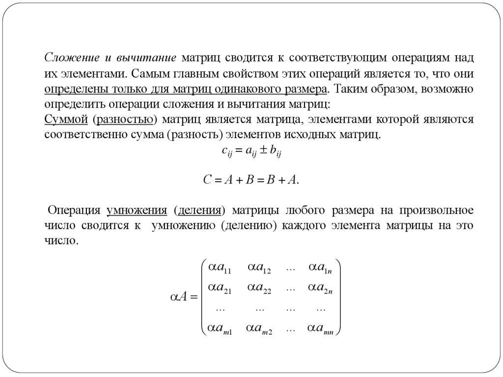 Сложение и вычитание матриц сводится к соответствующим операциям надих элементами. Самым главным свойством этих операций является то, что они