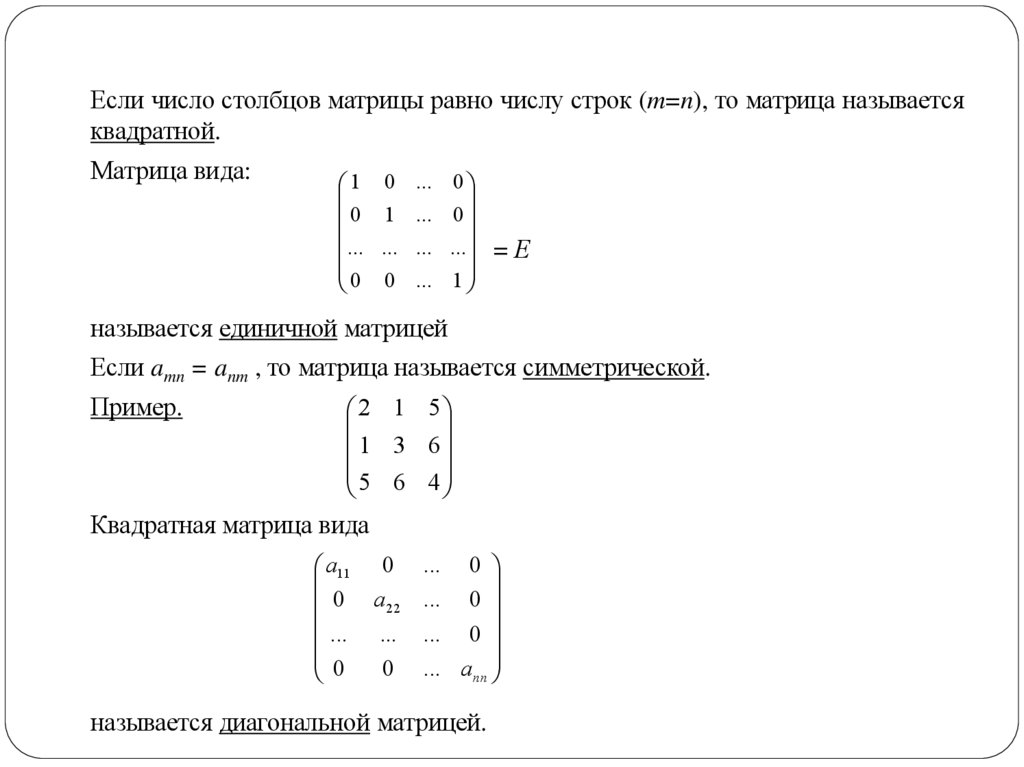 Если число столбцов матрицы равно числу строк (m=n), то матрица называетсяквадратной.