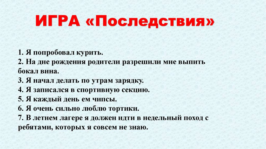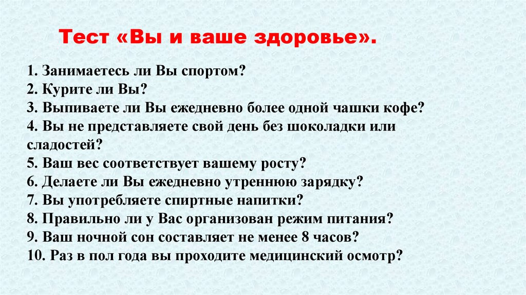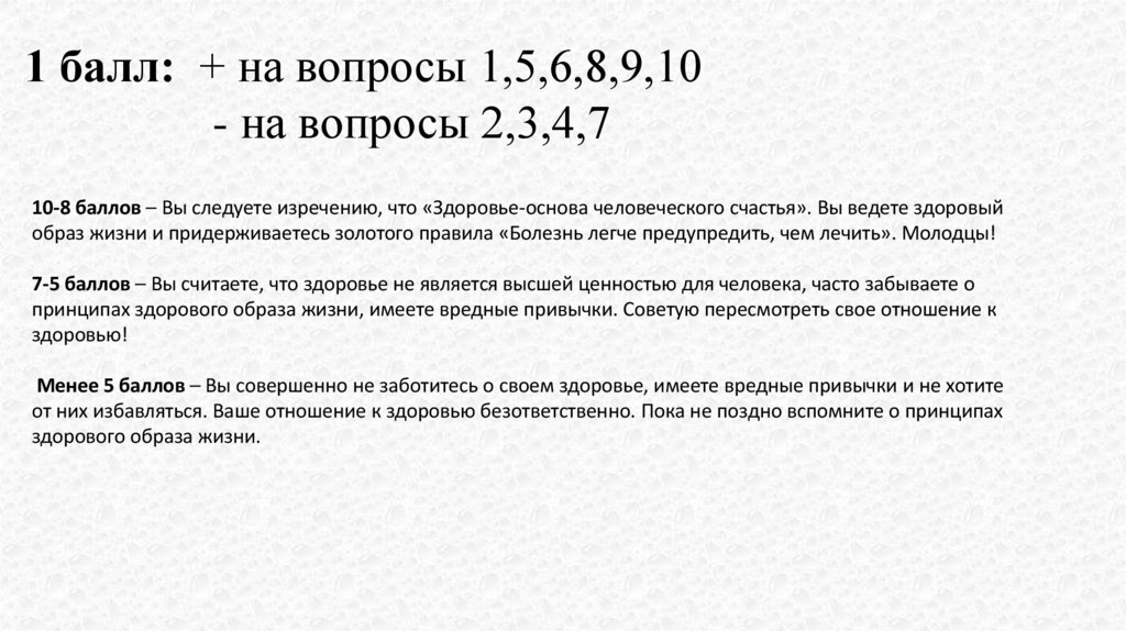 10-8 баллов – Вы следуете изречению, что «Здоровье-основа человеческого счастья». Вы ведете здоровый
