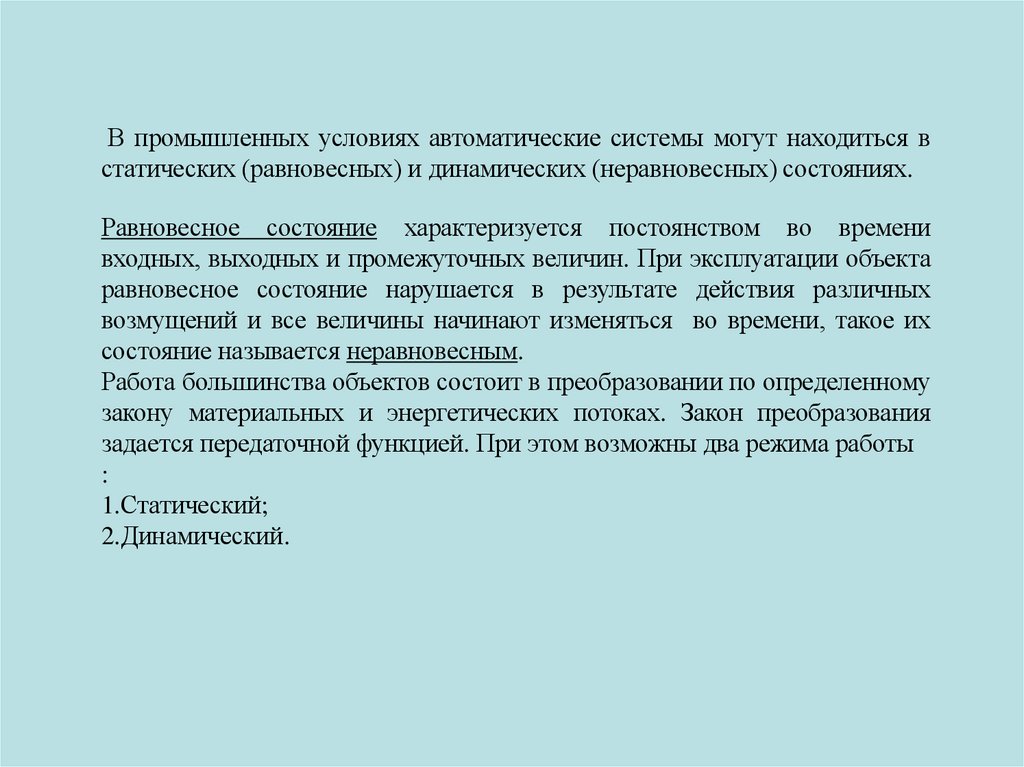 В промышленных условиях автоматические системы могут находиться встатических (равновесных) и динамических (неравновесных) состояниях.