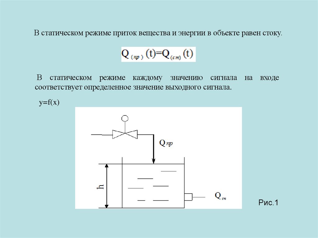 В статическом режиме приток вещества и энергии в объекте равен стоку.В статическом режиме каждому значению сигнала на входе