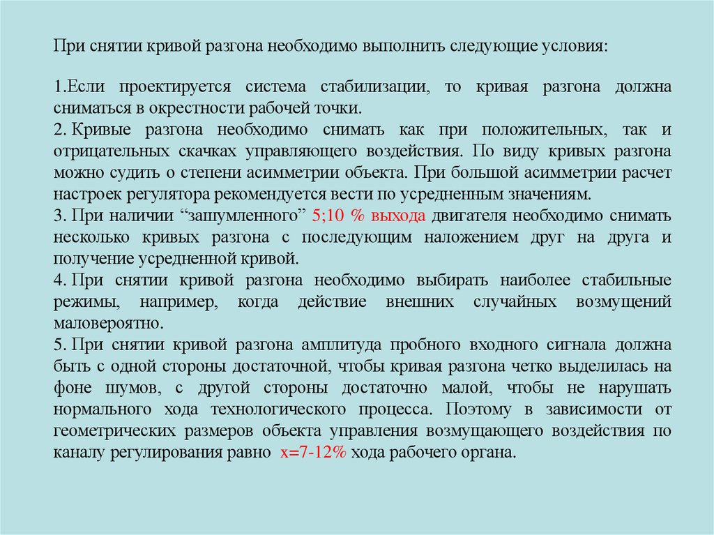 При снятии кривой разгона необходимо выполнить следующие условия:1.Если проектируется система стабилизации, то кривая разгона должна