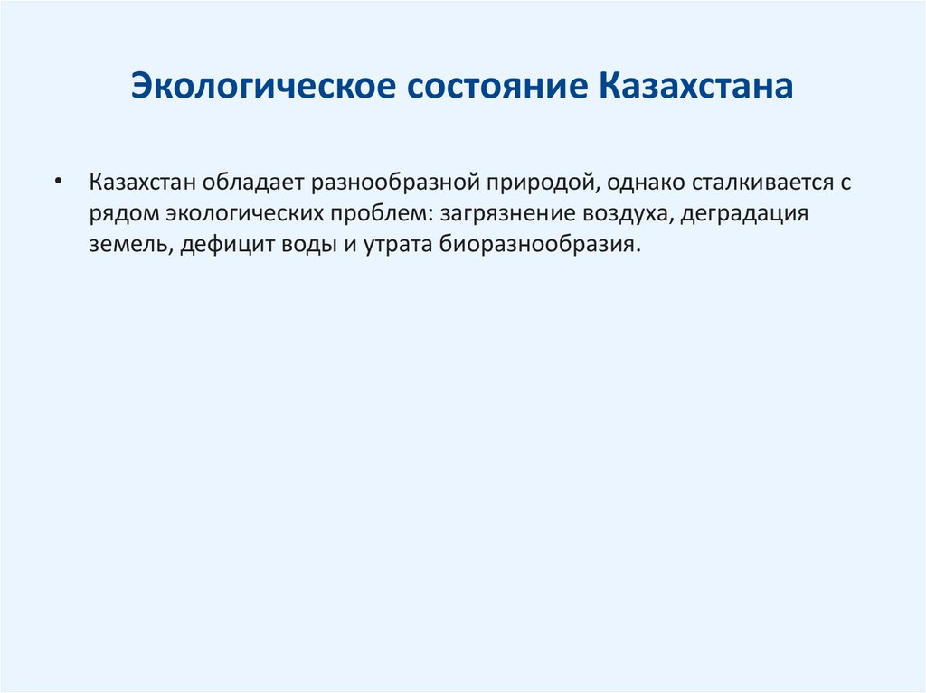Экологическое состояние Казахстана• Казахстан обладает разнообразной природой, однако сталкивается с