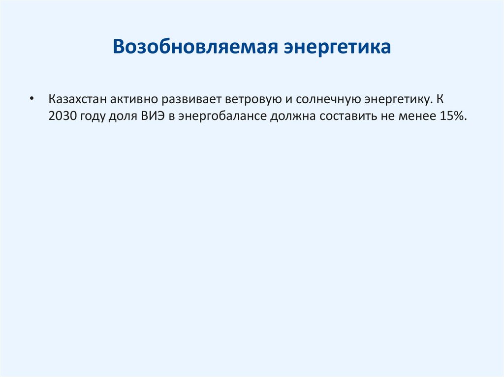 Возобновляемая энергетика• Казахстан активно развивает ветровую и солнечную энергетику. К