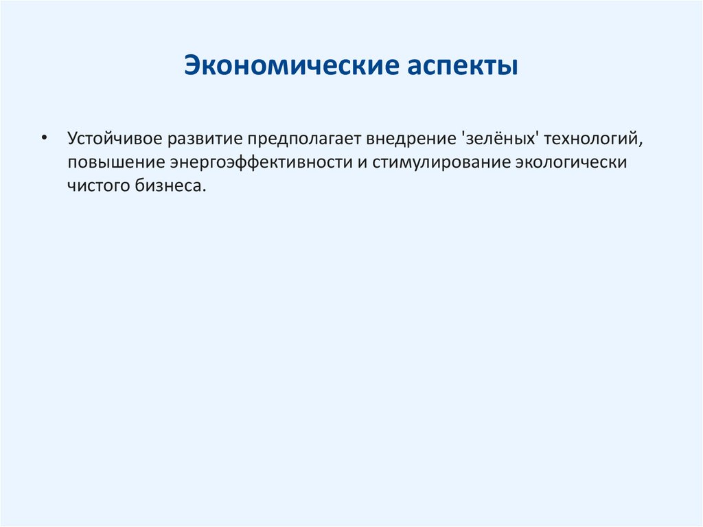 Экономические аспекты• Устойчивое развитие предполагает внедрение 'зелёных' технологий,