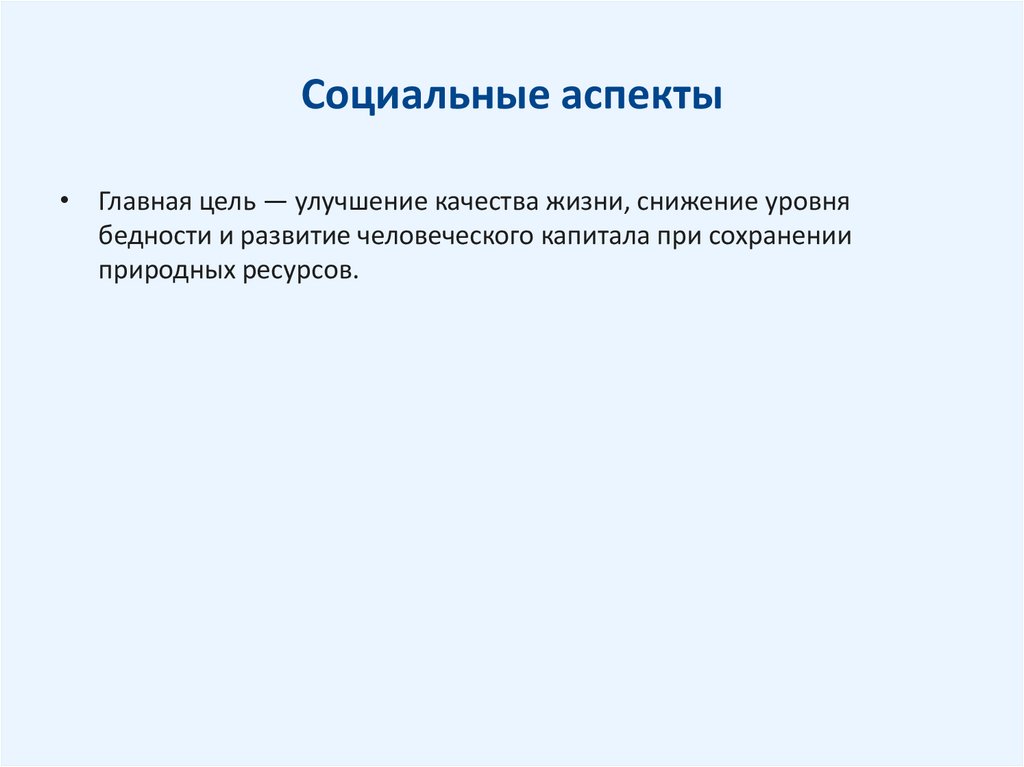 Социальные аспекты• Главная цель — улучшение качества жизни, снижение уровня