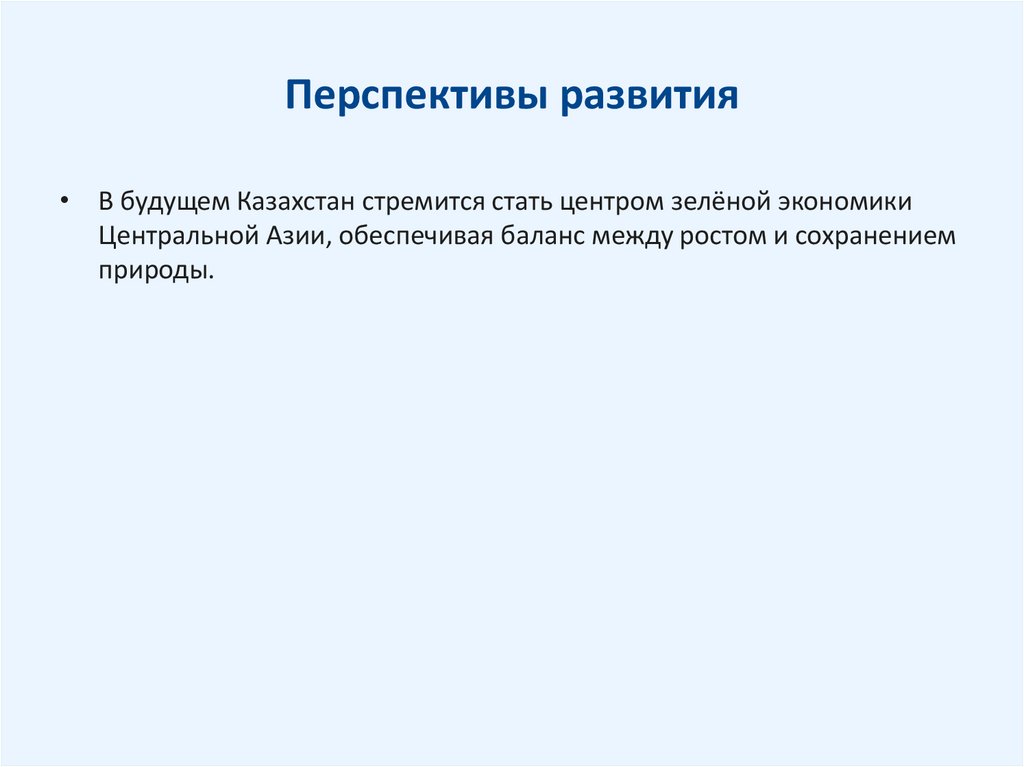 Перспективы развития• В будущем Казахстан стремится стать центром зелёной экономики