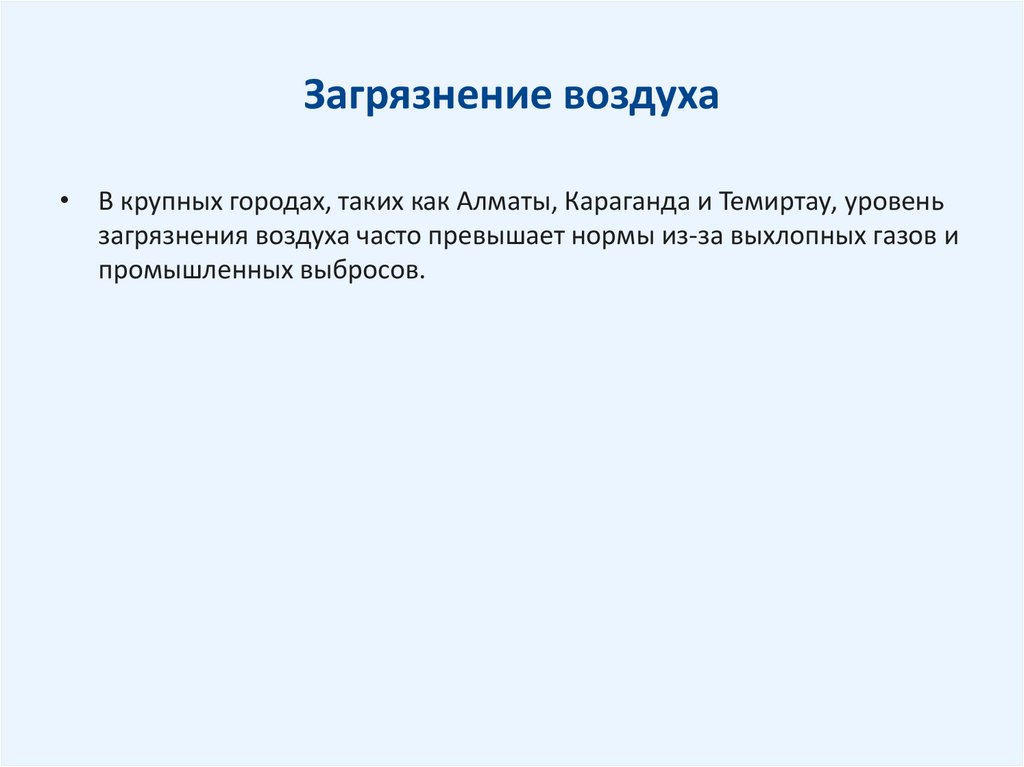 Загрязнение воздуха• В крупных городах, таких как Алматы, Караганда и Темиртау, уровень