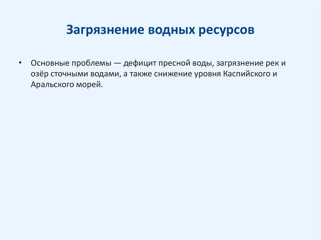 Загрязнение водных ресурсов• Основные проблемы — дефицит пресной воды, загрязнение рек и