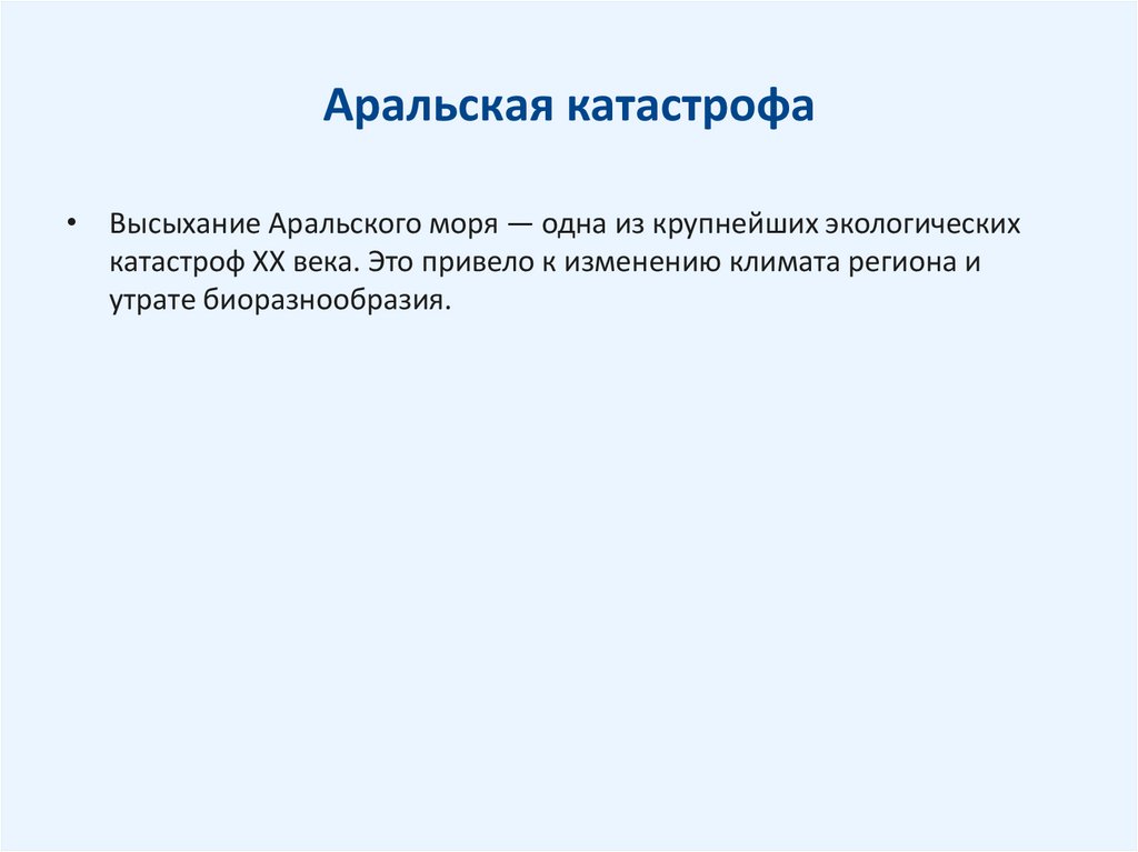 Аральская катастрофа• Высыхание Аральского моря — одна из крупнейших экологических