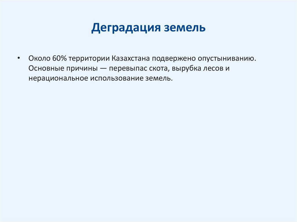 Деградация земель• Около 60% территории Казахстана подвержено опустыниванию.
