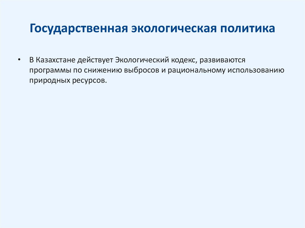 Государственная экологическая политика• В Казахстане действует Экологический кодекс, развиваются