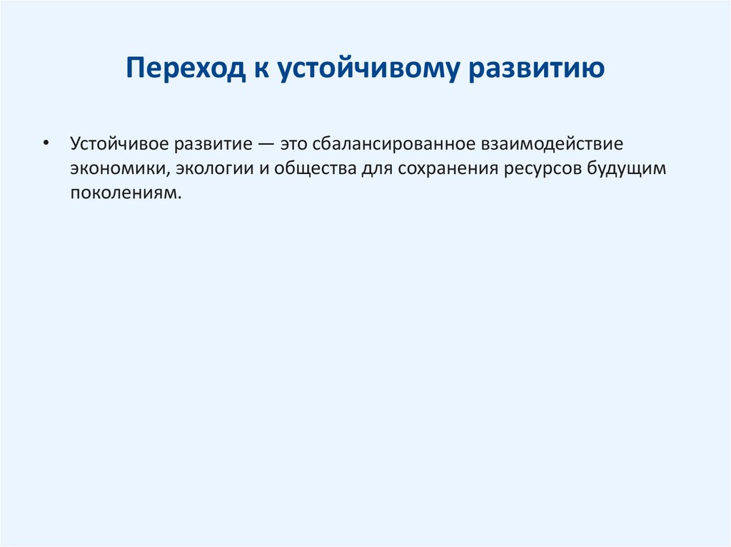 Переход к устойчивому развитию• Устойчивое развитие — это сбалансированное взаимодействие
