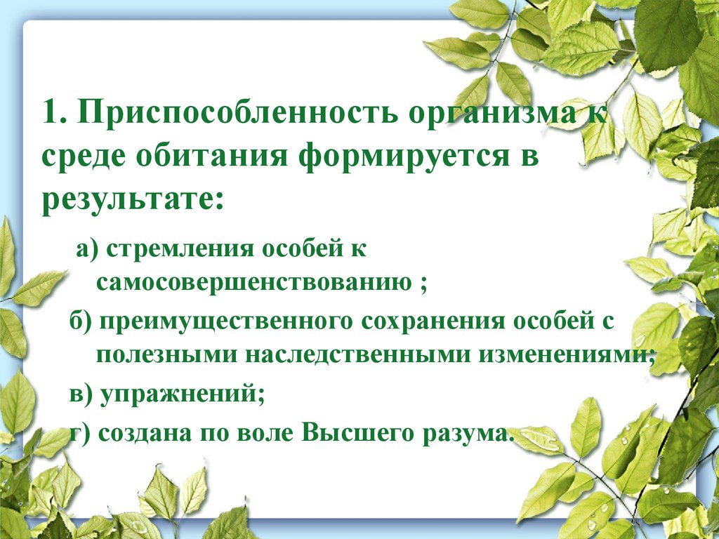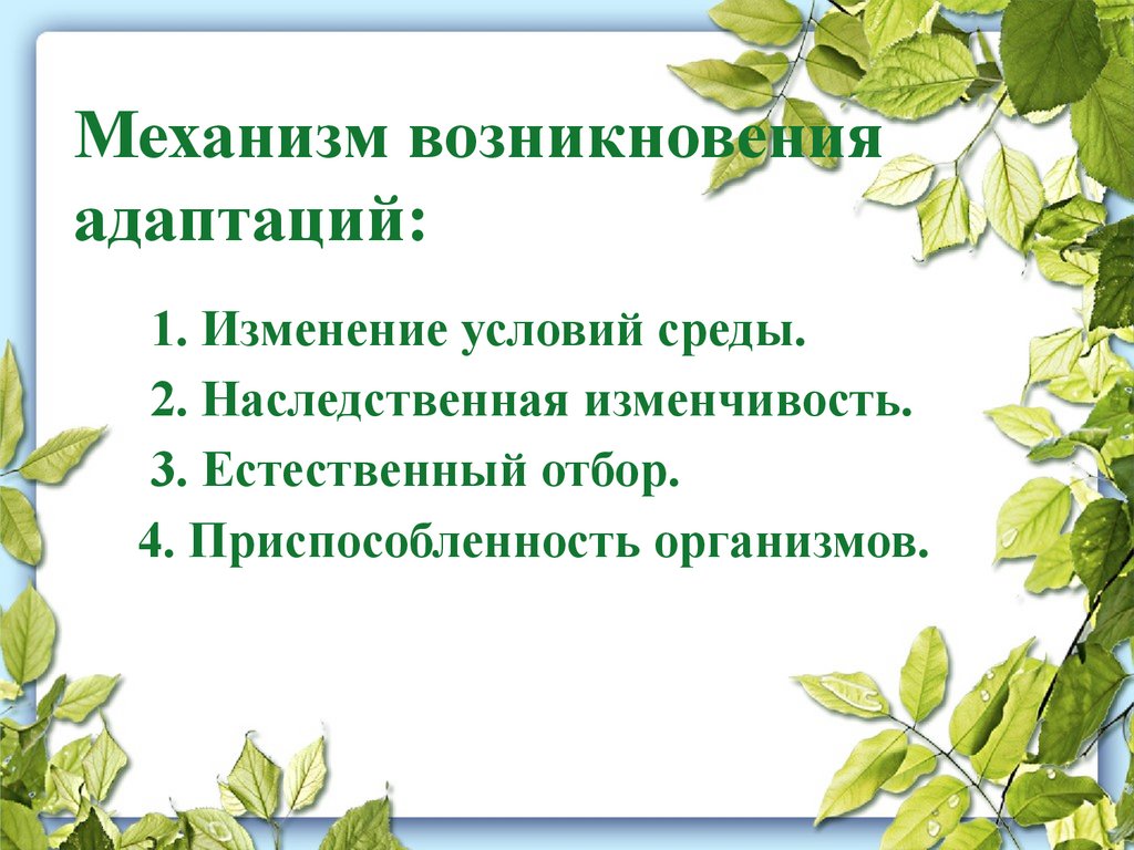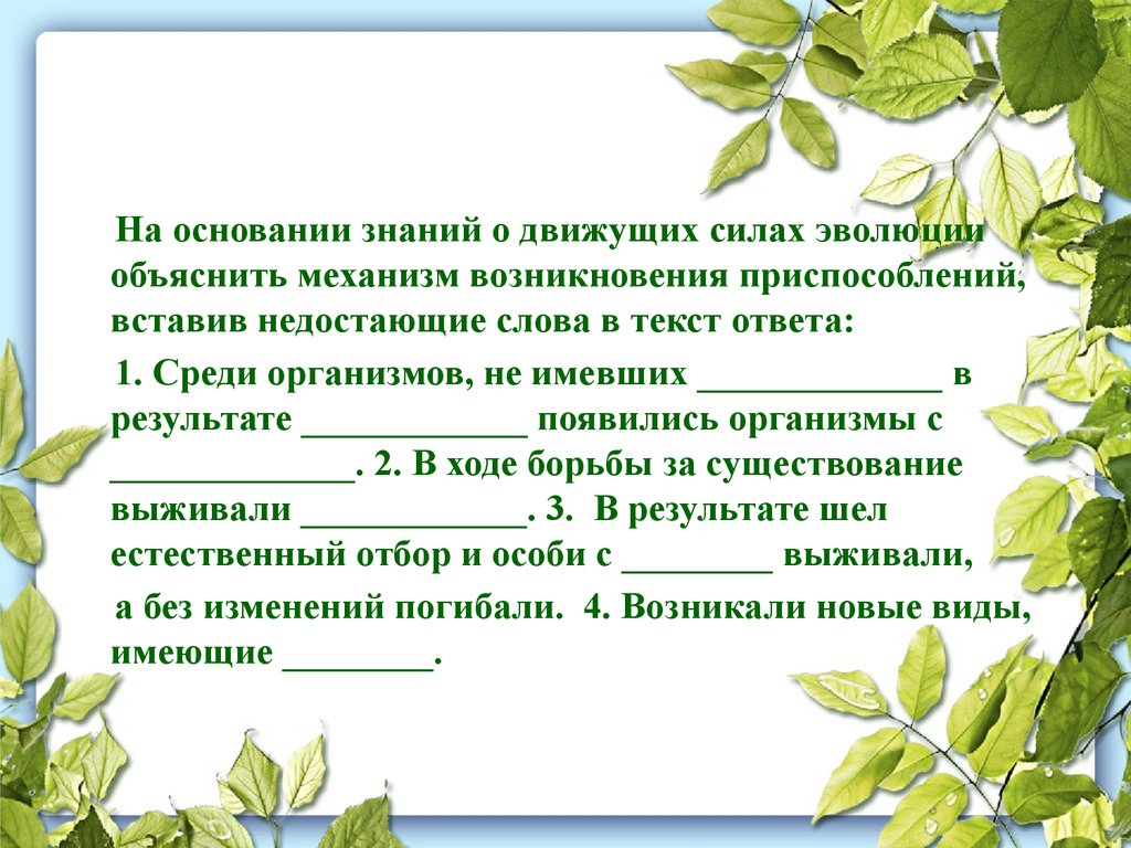 На основании знаний о движущих силах эволюцииобъяснить механизм возникновения приспособлений,