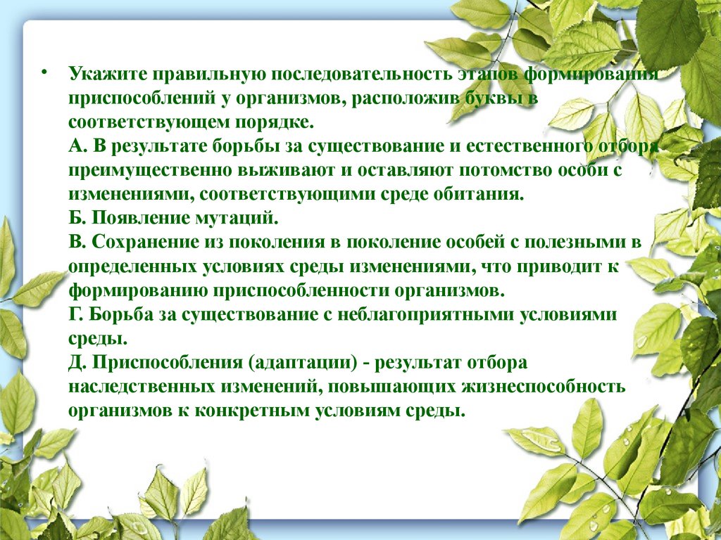 • Укажите правильную последовательность этапов формированияприспособлений у организмов, расположив буквы в