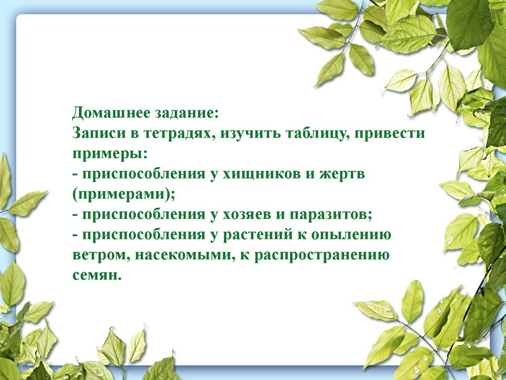 Домашнее задание:Записи в тетрадях, изучить таблицу, привести