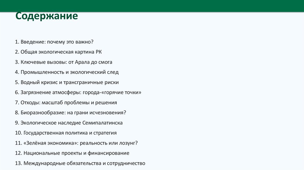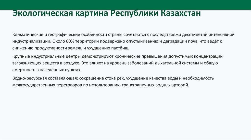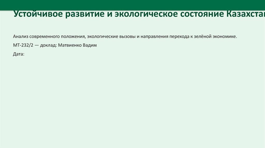 Устойчивое развитие и экологическое состояние КазахстанАнализ современного положения, экологические вызовы и направления перехода к зелёной экономике.