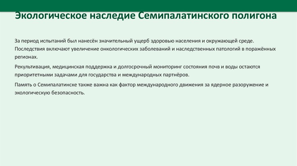 Экологическое наследие Семипалатинского полигонаЗа период испытаний был нанесён значительный ущерб здоровью населения и окружающей среде.