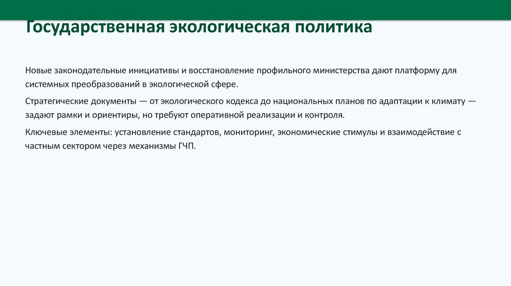 Государственная экологическая политикаНовые законодательные инициативы и восстановление профильного министерства дают платформу для