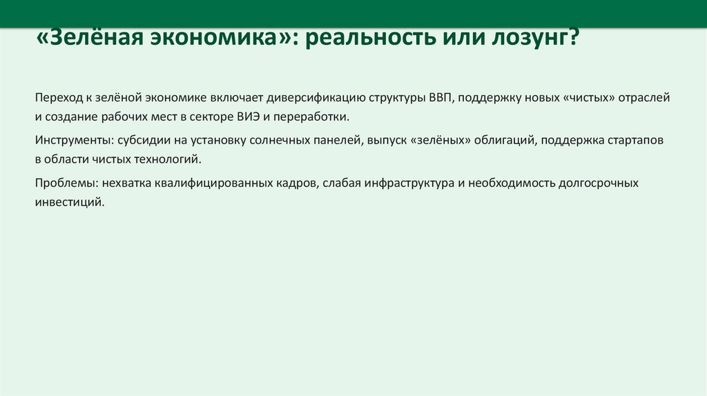 «Зелёная экономика»: реальность или лозунг?Переход к зелёной экономике включает диверсификацию структуры ВВП, поддержку новых «чистых» отраслей